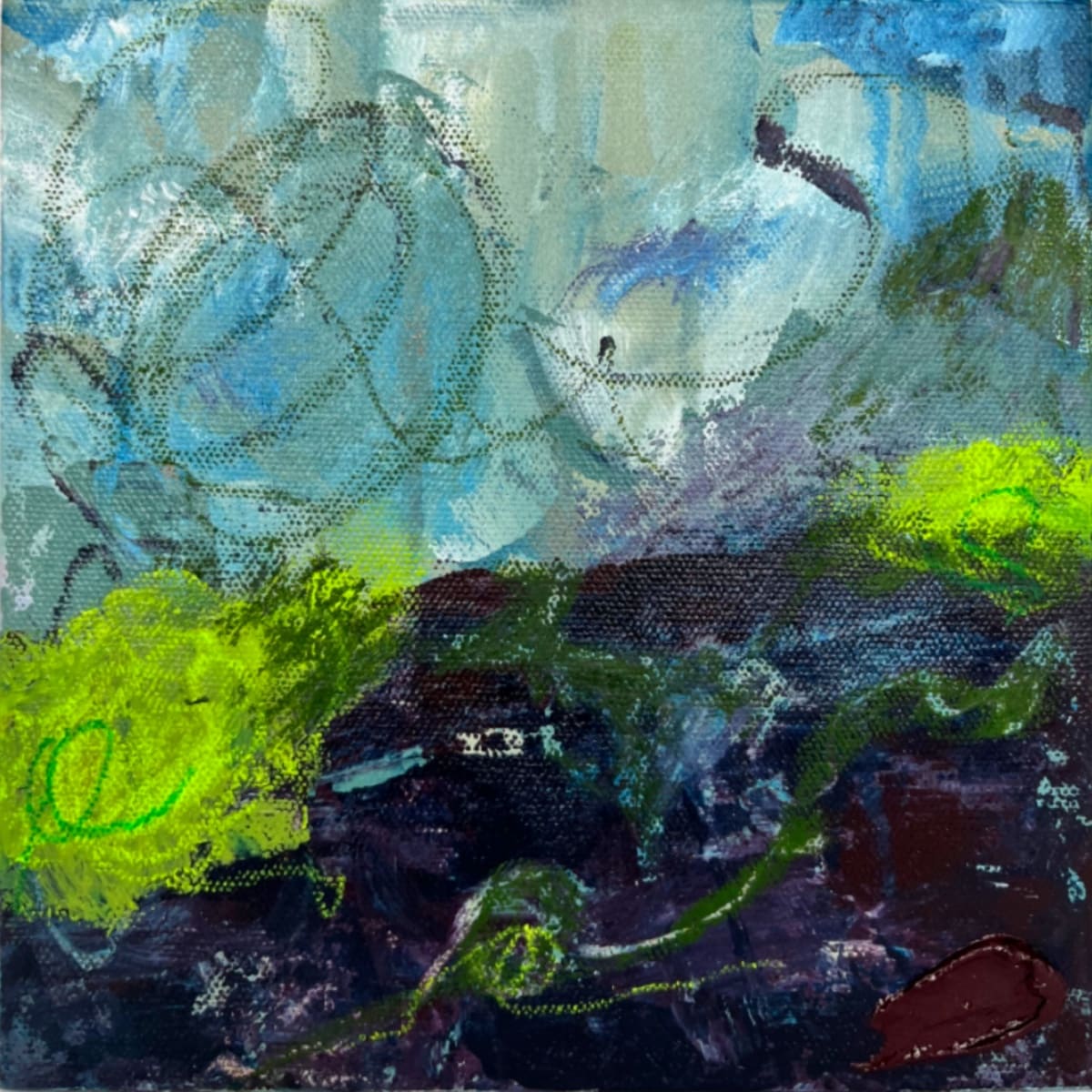 This eye-catching centerpiece with this Cottonwood I abstract painting. This 8x8x1.5-inch painting features mixed media techniques inspired by the mountains of the Cottonwood area, with subtle nuances that draw the viewer in. Experience a new perspective of nature with this unique piece of art.