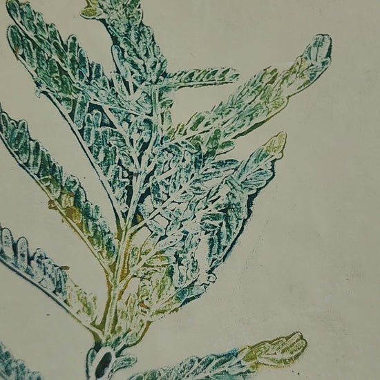Each monoprint is carefully created by hand using the actual leaves of the Desert Bird of Paradise, resulting in textures and details that cannot be replicated. The process leaves behind natural imprints that celebrate movement, light, and the spirit of the desert.