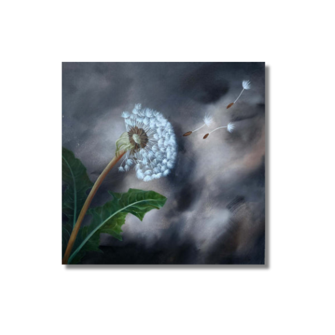 A meditative study in realism and emotion, this piece captures the delicate transition of a dandelion releasing its seeds into the wind—a moment of surrender, hope, and trust. Painted with a blend of acrylic and oil, the work layers softness and detail to evoke the quiet beauty of letting go.