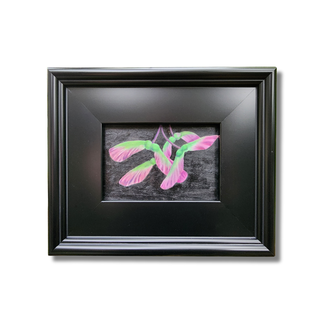 Maple Samaras Still Life captures the quiet poetry of nature’s design — the delicate symmetry of maple seeds suspended in luminous pink and green. Against a dark background, their soft glow and intricate form evoke a sense of renewal, lightness, and transformation.
