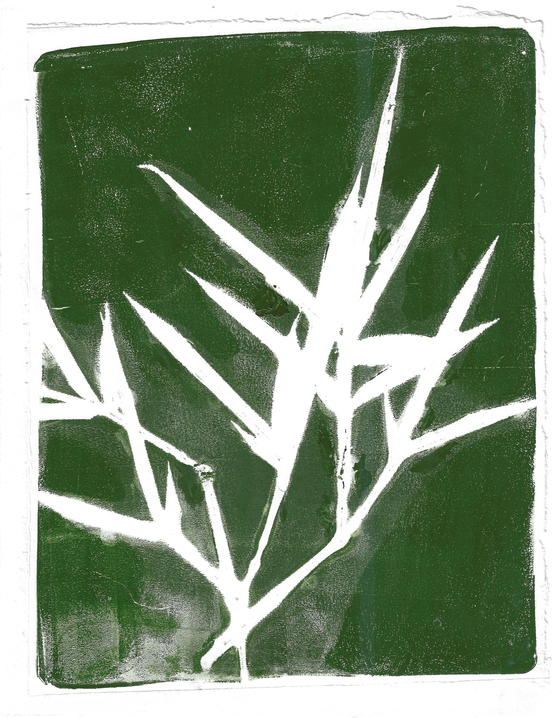 Original bamboo monoprint titled 'Resting Light'. This 8x10 in print is matted in a 16x20 in mat archival mat. Each piece is hand-pulled using real bamboo leaves gathered from peaceful walks outside my studio. One-of-a-kind, ready to frame. Buy 2 large prints, get 10% off — perfect for mindful art collectors and nature lovers.