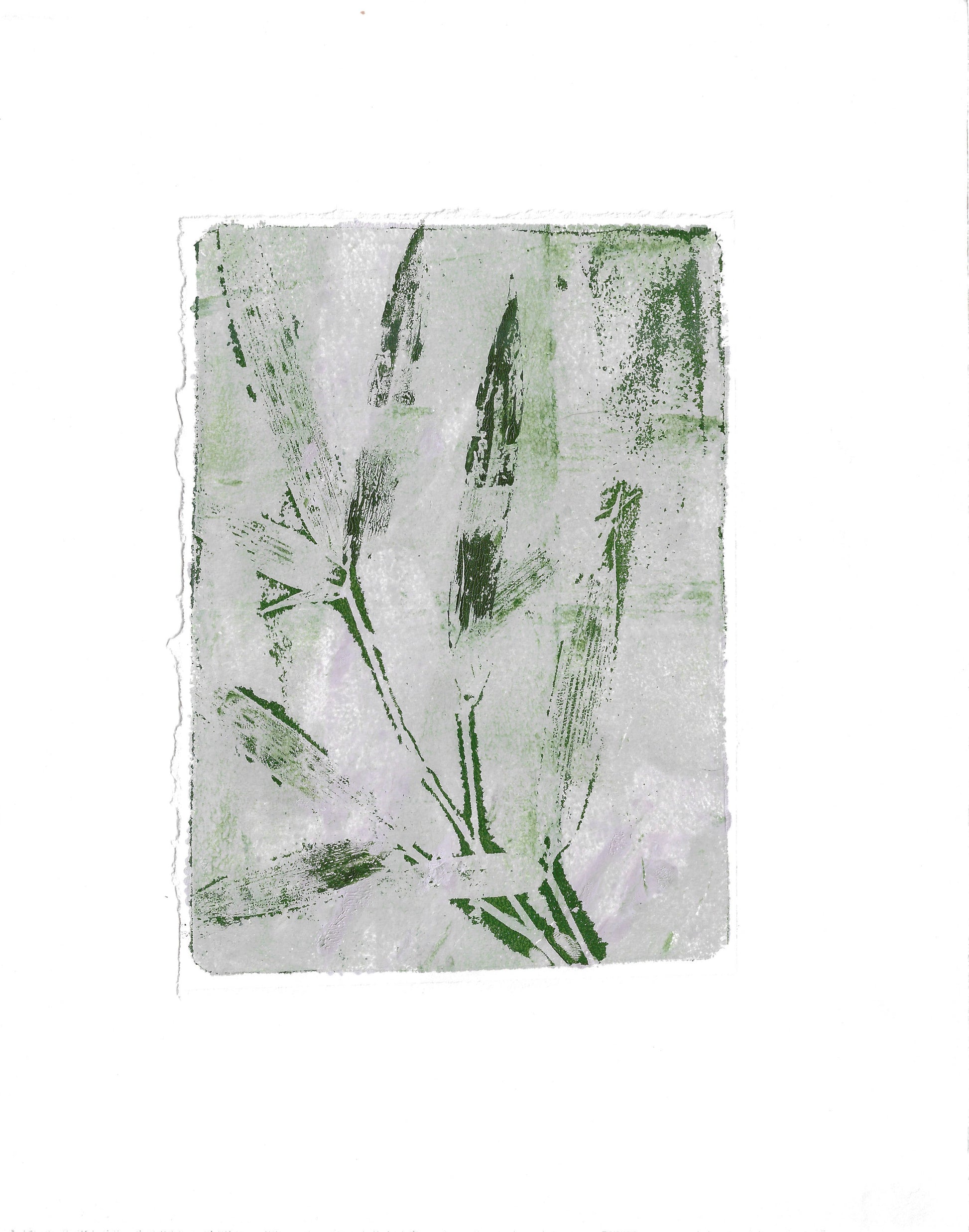 Original bamboo monoprint titled 'Stillness Speaks'. This 5x7 in print is matted in a 11x14 in mat archival mat. Each piece is hand-pulled using real bamboo leaves gathered from peaceful walks outside my studio. One-of-a-kind, ready to frame. Buy 2 small prints, get 10% off — perfect for mindful art collectors and nature lovers.